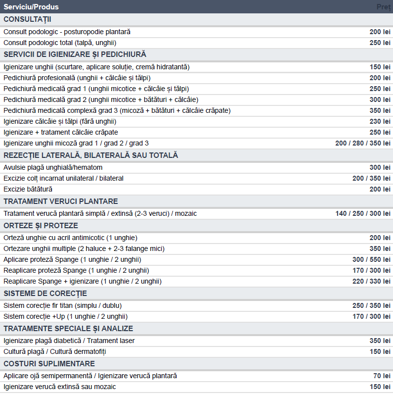 Servicii podologie – Listă prețuri